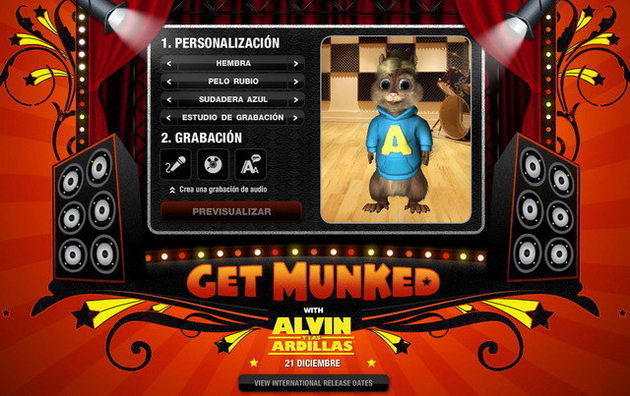 Para el próximo estreno de Alvin y las Ardillas, se ha creado una aplicación online que permite crear avatares de los simpáticos personajes, grabar mensajes y enviarlos con voz de ardilla e incluso integrarlo en html.