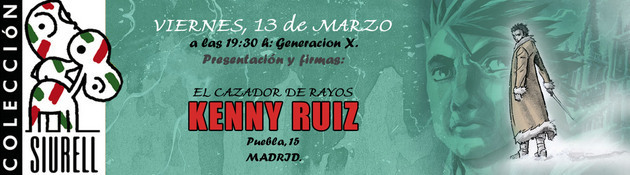 Te invitamos a participar en la presentación de EL CAZADOR DE RAYOS y sesión de firmas de KENNY RUIZ en la Librería GENERACIÓN X de Madrid (Puebla, 15) este viernes, 13 de marzo, a las 19:30 h.