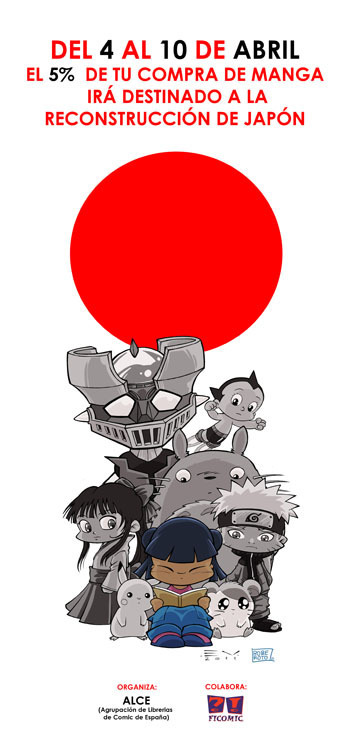 Un grupo de librerías especializadas de cómic de todo el Estado Español, sensibilizado por la magnitud de la tragedia que ha sufrido Japón en las ultimas semanas, ha decidido donar un 5% de la recaudación de las ventas de Manga que se haga entre el 4 y el 10 de abril. La cantidad recaudada se donará a una organización humanitaria japonesa siguiendo las indicaciones de las autoridades diplomáticas japonesas en España. Las librerías de cómic han tomado dicha iniciativa conocedoras de la solidaridad que se ha generado entre los seguidores del manga y de la cultura popular japonesa. Las 32 librerías que se han unido en dicha iniciativa son las siguientes: -dreamers.es de Malaga -Landromina de Terrasa -Norma Cómics Sabadell de Sabadell -Nikochan cómics de Badalona -Libreria noveno arte de Aviles -Nexus-4 de Santander -Tienda Dtbos de Salamanca -Kikomic de A Coruña -Universal de Barcelona -Enigma cómics de Madrid -Norma cómics Vigo de Vigo -Sousa cómics de Vigo -Totcomic de Barcelona -Avalon Burgos de Burgos -Arte 9 Cruz de Madrid -Shen cómics de Madrid -El Mono-araña de Madrid -Zuloa Irudia de Vitoria -La parada de los cómics de Valladolid -Mazinger Gijón de Gijón -Zona 84 de Ciudad Real -Alita Cómics de A Coruña -Gotham cómics de Palma de Mallorca -Norma Cómics Palma de Palma de Mallorca -Toma3 de Gijón -Shazam cómics de Granada -Todolibros de Cáceres -Librería FM de Marbella -Atom cómics de Madrid -FantasyTienda de San Feliu de Llobregat -Haiku de Barcelona - Mazinger de Oviedo | |||||