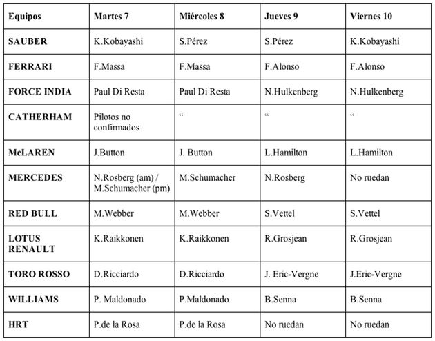 Programa de pilotos para la semana próxima:Este será el programa de pilotos para la semana próxima, siempre sujeto a modificaciones de última hora por parte de los equipos.