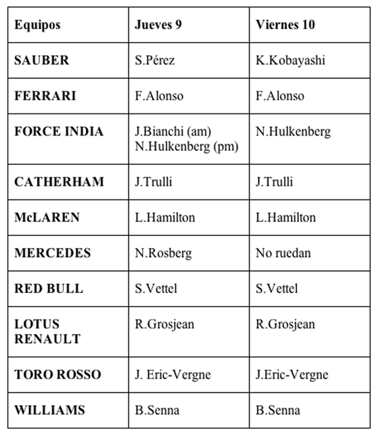 Los pilotos que saldrán en pista este Jueves y Viernes son: