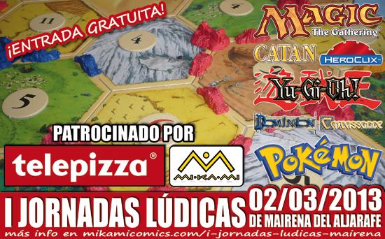 Mikami Comics, en colaboración con Telepizza, el periódico aunmetro:desevilla y el Ayuntamiento de Mairena del Aljarafe, se complace en anunciar las I Jornadas Lúdicas de Mairena del Aljarafe, que tendrán lugar el Sábado 2 de Marzo de 2013, de 11:00 a 21:00 en el Centro Comercial Aljarafe Center.